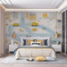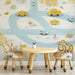 The Overhead City Street Map Mural is a highly engaging, interactive scene. It depicts an overhead view of a busy cartoon town with roads, parks, and stylized buildings in yellow, gray, and blue. Various toy-like yellow and orange cars move along the light blue streets. This mural encourages imaginative play and is perfect for a child's bedroom or play area, potentially serving as a fun play mat design.
