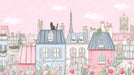 Parisian Rooftops Cityscape Mural Wallpaper | Pastel Pink and Blue, Cat on Roof, Fine Sketch Texture