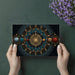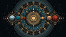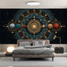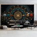 The Planetary Alignment Mandala Mural Wallpaper is a detailed and balanced depiction of a solar system within a mandala. The central sun radiates warm gold light, surrounded by symmetrical orbits of planets (including red, blue, and brown spheres) and rings of intricate teal and gold patterns. The overall composition is dense, dark, and highly ornamental, suggesting a mythological or ancient astronomical interpretation of the cosmos. This mural is perfect for a sophisticated study, a living room, or a bedroom seeking a powerful, intricate, and historically inspired focal point.