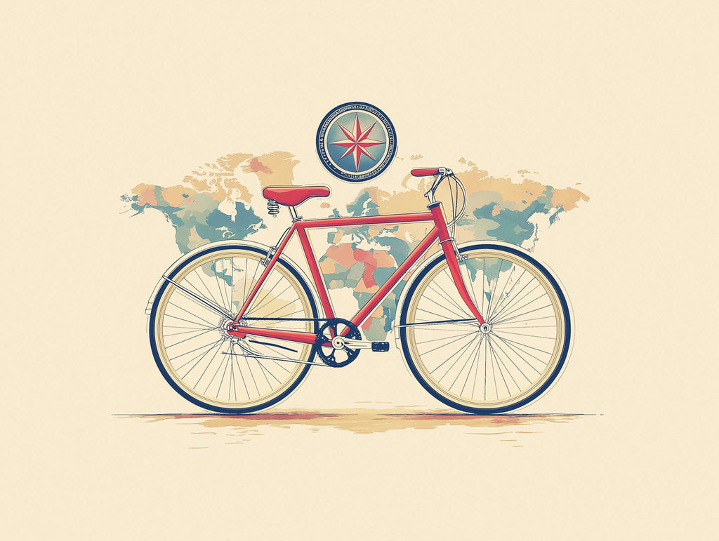 The Pop of Red Bicycle on Vintage Map Mural Wallpaper is a bold and energetic travel piece. A striking red bicycle with white tires and a red seat is the focal point, set against a watercolor-style world map background featuring muted, earthy tones. A detailed, classical compass rose adds to the vintage travel theme. The clean illustration style and vibrant red frame create a dynamic contrast with the softer, aged map behind it. This mural is ideal for a stylish study, a vibrant creative space, or a office dedicated to fitness and exploration.