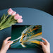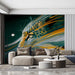The Speed Jaguar Head Profile Mural Wallpaper is a sharp, futuristic illustration focused on motion. The detailed profile of a jaguar's head is shown dissolving into streaks of vibrant gold, yellow, and pale white, creating the effect of extreme speed against a deep teal and dark green background. The clean vector lines and strong color blocking emphasize the feeling of aerodynamic velocity and controlled power. This mural is an ideal choice for a stylish study, a modern teenager's room, or an automotive/tech-themed entertainment area.