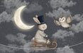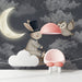 The nighttime companion to the previous design. This mural creates a cozy bedtime atmosphere with a dark grey starry sky. The bunny, now wearing a top hat, rides a sled across the tightrope, accompanied by the owl and a glowing crescent moon. Perfect for encouraging sweet dreams.