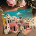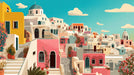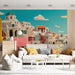 Textured Pastel Mediterranean Hillside Mural Wallpaper | Soft Pink Architecture Coastal Charm