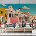The Textured Pastel Mediterranean Hillside Mural Wallpaper is a dreamy and artistic artwork. It features a Mediterranean village rendered in a soft, stippled style with a palette of rose pink, buttery yellow, and seafoam green. The grainy texture and pastel tones create a romantic, vintage-inspired coastal scene. This mural is ideal for a tranquil living room, a sophisticated nursery, or a space where soft, nostalgic beauty is desired.