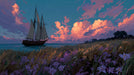 The Twilight Sailing Schooner Mural Wallpaper is a moody, romantic, and ethereal artwork. It features a two-masted schooner sailing near a wooded coastline under a starry, deep blue sky dominated by dramatic clouds lit from below in pinks and purples. The foreground is alive with bright purple and white wildflowers, creating a beautiful contrast between the terrestrial and the nautical. The cool, low-light palette creates a sense of mysterious, late-night adventure. This mural is ideal for a sophisticated bedroom, a quiet playroom, or a space with a romantic, contemplative mood.