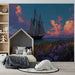 Twilight Sailing Schooner Mural Wallpaper | Purple and Pink Sky, Starry Night, Foreground Flowers