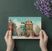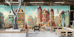 The Victorian Town Watercolor Christmas Mural Wallpaper is a vibrant and cheerful artwork. It features a row of ornate Victorian-style townhouses painted in bright, stylized shades of red, teal, pink, and yellow. A prominent reindeer-drawn sleigh sits in the street, creating a festive, lively urban scene under a snowfall. The watercolor style and bold colors create an energetic, whimsical, and joyous holiday aesthetic. This mural is ideal for a lively family room, a themed hallway/entryway, or a retail space during the Christmas season.