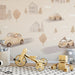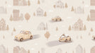 The Vintage Car & Village Mural is a soft and charming continuous design. It features stylized, vintage cars (VW Beetle-like) carrying happy animals, driving through a quaint village of simple houses and trees. The entire scene is rendered in a soft watercolor style with a dominant beige and pale taupe neutral palette, creating a cozy, gentle, and timeless storybook feel. This mural is ideal for a nursery or a young child's study.