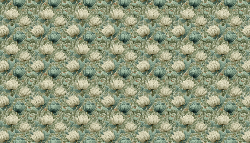 Bring a touch of timeless elegance to your home with this vintage floral wallpaper. The repeating pattern features large, delicate blossoms reminiscent of peonies or poppies, intertwined with graceful leaves and budding flowers. The detailed, hand-drawn style and refined color palette of off-white, dusty teal, and soft green give this botanical wallpaper a serene and classic feel. It's an ideal choice for a master bedroom, an elegant dining room, or a tranquil living area.