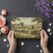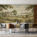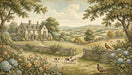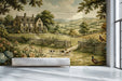 Evoke a sense of timeless elegance with this sprawling pastoral wall mural. The design depicts a detailed, vintage-style illustration of a stately English country manor house set within rolling, stone-fenced hills. The foreground is a richly detailed cottage garden with blooming pink roses and light blue hydrangeas, framed by magnificent, ancient oak trees with autumnal foliage. A dirt path leads up to the manor, with a pair of beagles and a couple of pheasants adding life to the landscape. The muted, sun-kissed palette of sage green, antique gold, cream, and soft blues creates a nostalgic and peaceful ambiance. Perfect for a traditional dining room, a library, or a charming living room feature wall.