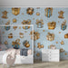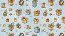 The Vintage Toy and Gift Pattern Wallpaper is a dense, nostalgic pattern featuring detailed, hand-sketched illustrations of wrapped gifts, stars, teddy bears, and other holiday toys. The color palette is restricted to a rich gold/ochre and cool blue/teal against a pale blue background, giving the pattern a vintage, storybook feel. The high level of detail and repeating motifs create a warm, busy, and comforting holiday aesthetic. This mural is ideal for a child's playroom, a family room, or a space celebrating classic, cozy Christmas imagery.