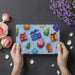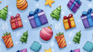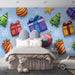 The Watercolor Gifts and Ornaments Scatter Wallpaper is a cheerful, lively pattern of watercolor illustrations. Various Christmas elements—wrapped gifts in vibrant red, purple, and gold, green Christmas trees, and pink ornaments—are scattered across a soft, light blue background with white snowflakes. The bright, jewel-toned colors and the loose, dynamic arrangement create a playful and energetic holiday atmosphere. This mural is ideal for a youth room, a creative studio, or a space where bold, modern holiday colors are welcome.
