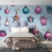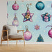 The Whimsical Pink and Teal Ornament Pattern Wallpaper is a highly decorative, scattered pattern of various vintage-style Christmas ornaments (globes, stars, lanterns, gifts). The color palette is unique and feminine, dominated by hot pink/magenta, deep teal, and gold, set against a soft, icy blue background with snowflakes. The watercolor illustration style gives the ornaments a detailed, glittering quality. This mural is ideal for a entryway, a chic dressing room, or a space seeking a unique, playful, and colorful holiday aesthetic.