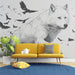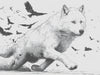 White Wolf Running with Raven Swarm High-Contrast Black White Ink Sketch Mural Wallpaper | Dynamic Wildlife